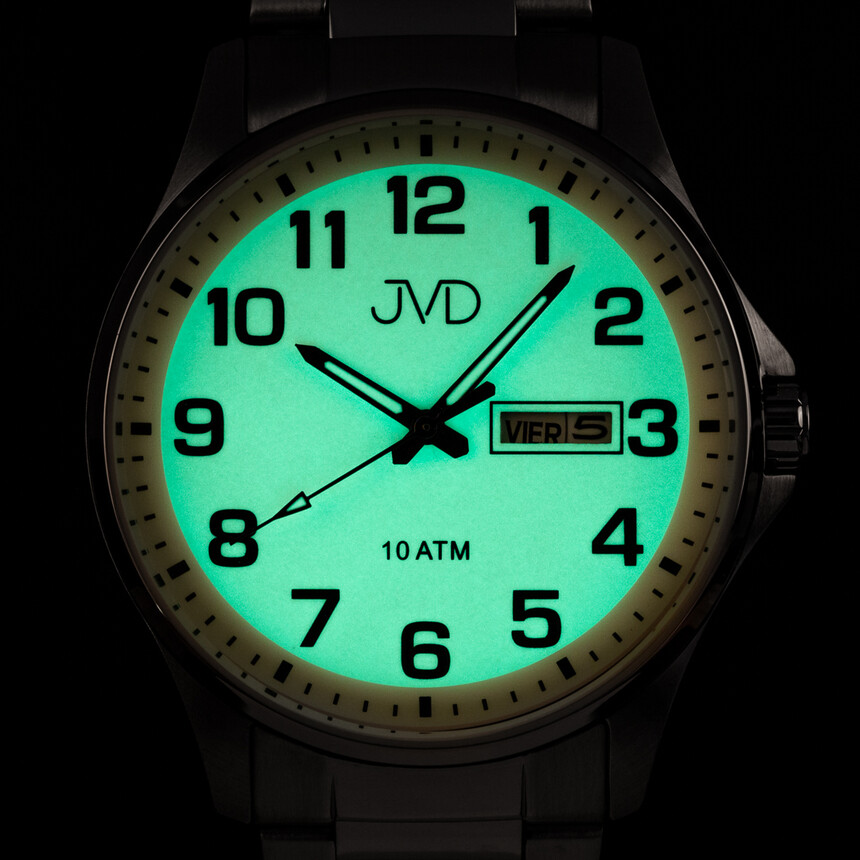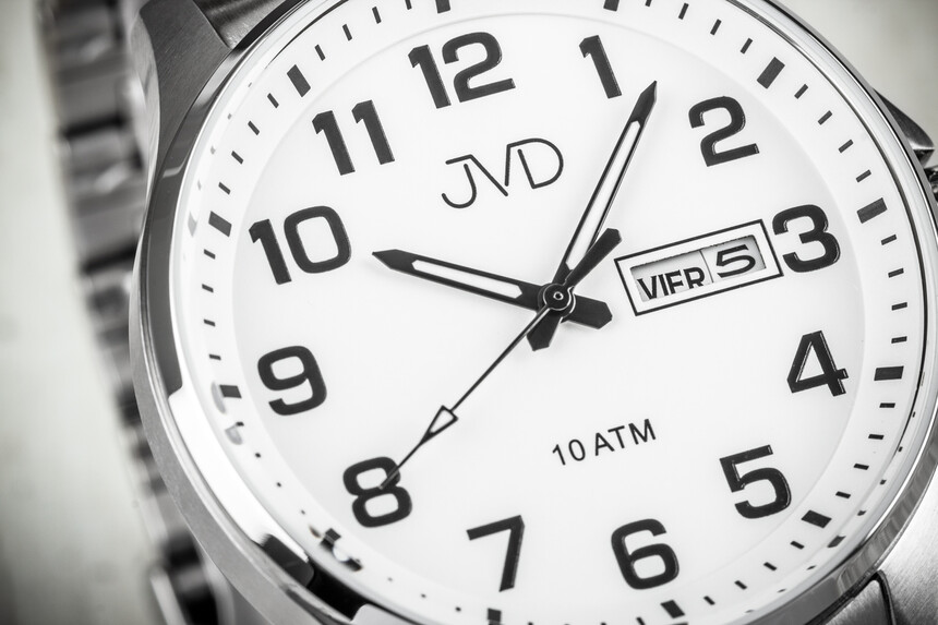 Duże, przejrzyste cyfry, indeksy minutowe, kontrastowe wskazówki, luminescencja i datownik. Wszystko to mają zegarki JVD. Koperta jest stalowa, do tego o większej średnicy, a wodoszczelność 100 m sprawia, że żaden zwykły kontakt z wodą nie będzie problemem. Wyświetlają też dzień tygodnia.