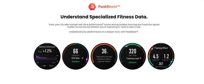 Amazfit oczywiście nie odstaje też sportowo i nie daje się zawstydzić. Również tutaj znajdziemy trenera AI, który potrafi przygotować plan treningowy i dostosować go do waszego aktualnego stanu. A także wszystkie kluczowe dane treningowe, do których zapożyczyłem grafikę ze strony producenta.