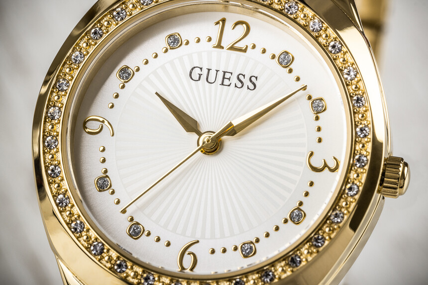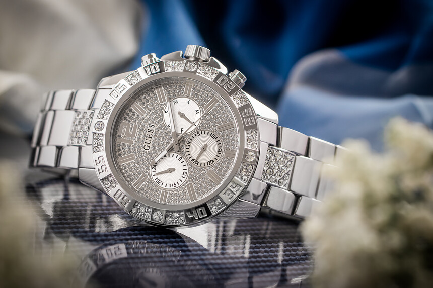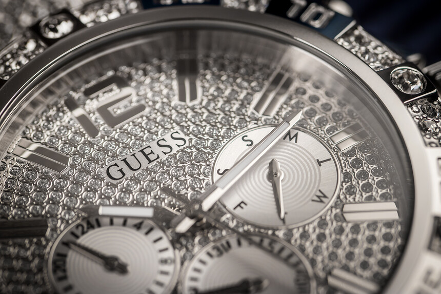 Poza rozmiarem zegarek lśni tysiącami błyszczących kryształków, na których marka Guess nigdy nie oszczędzała.