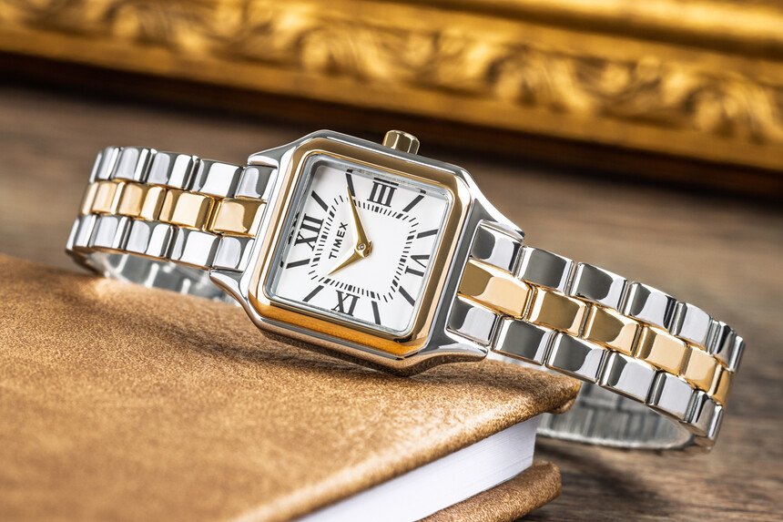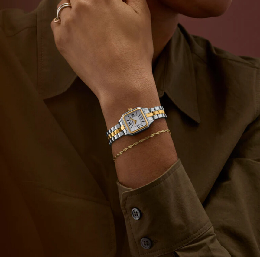 Drobny rozmiar i ścięte cyfry rzymskie nawiązują do damskich projektów z minionego stulecia. Wykonanie i stalowa koperta są jednak współczesne, podobnie jak praktyczna bransoleta ze składanym zapięciem.