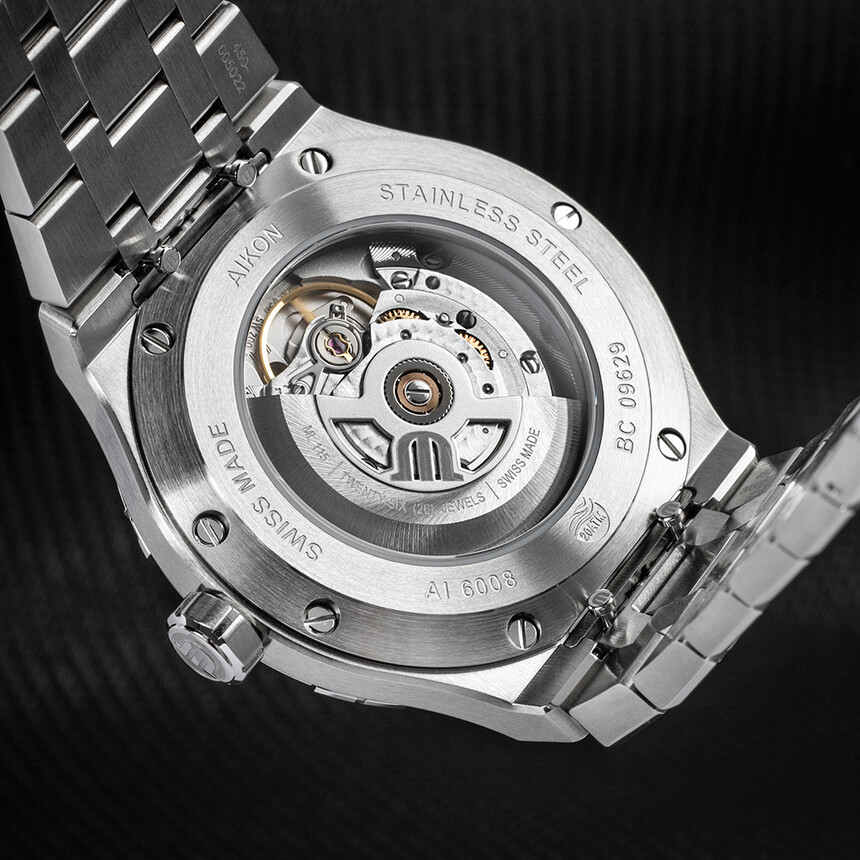 Jednocześnie dekiel jest przeszklony szafirowym szkłem, więc Aikon oferuje podgląd mechanicznego werku. Plusem jest to, że mechanizm jest dopracowany i zdobiony, i dobrze się na niego patrzy. Minusem zaś – że na szkle niewiele da się wygrawerować.