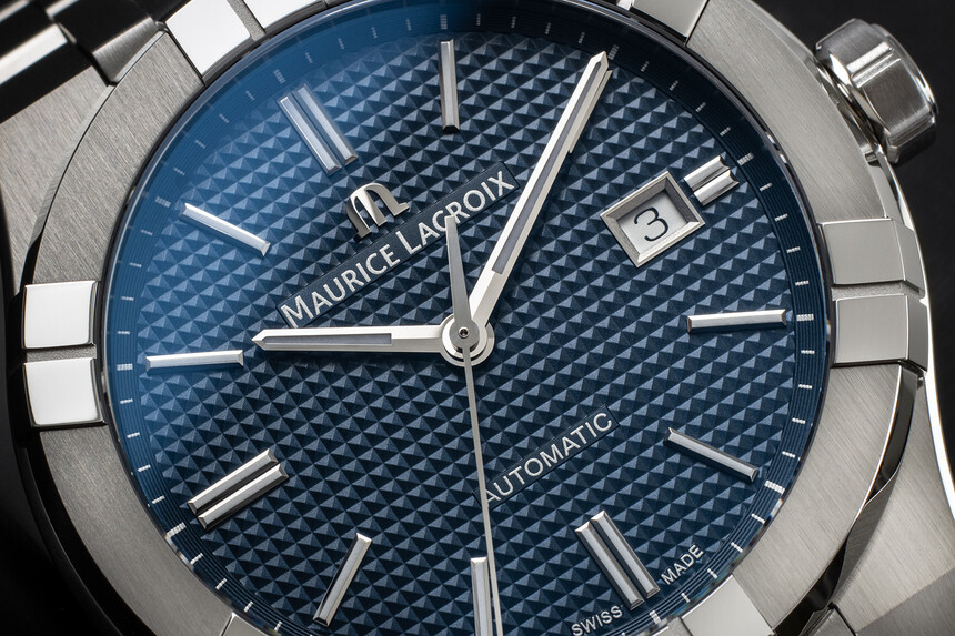 Na tarczy znajdziemy też aplikowane logo z nazwą firmy Maurice Lacroix pod godziną 12, na 6 obowiązkowy napis SWISS MADE, a między indeksem godziny 6 a wskazówkami napis AUTOMATIC. Aikon występuje bowiem zarówno w wersji mechanicznej, jak i kwarcowej, więc ten napis to jeden z wyróżników typu mechanizmu.