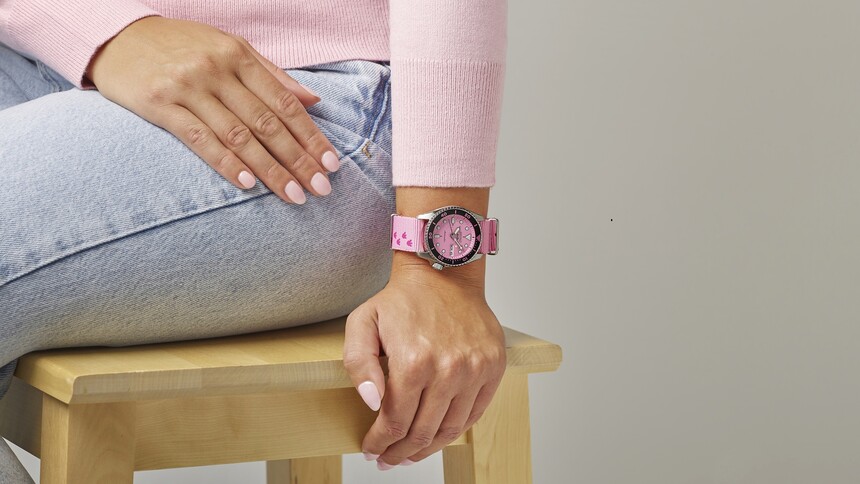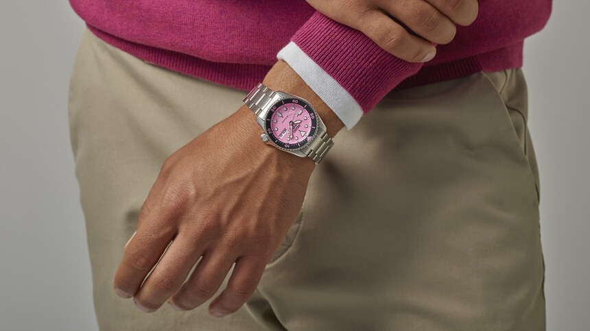 Różowe szkło w deklu odsłania klasyczny seikowski automatyczny kaliber 4R35 z komplikacją day-date i rezerwą chodu około 40 godzin. Model należy do serii SKX, więc cały projekt utrzymano w klasycznej stylistyce zegarka nurkowego. To wersja w mniejszym rozmiarze, o średnicy 38 mm. Ten rozmiar zyskał popularność nie tylko w klasycznych kolorach, jak czerń czy granat, ale także w odcieniu Tiffany Blue. Dzięki mniejszej kopercie nie są tak masywne i wręcz zachęcają do zabawnego, swobodnego stylu.