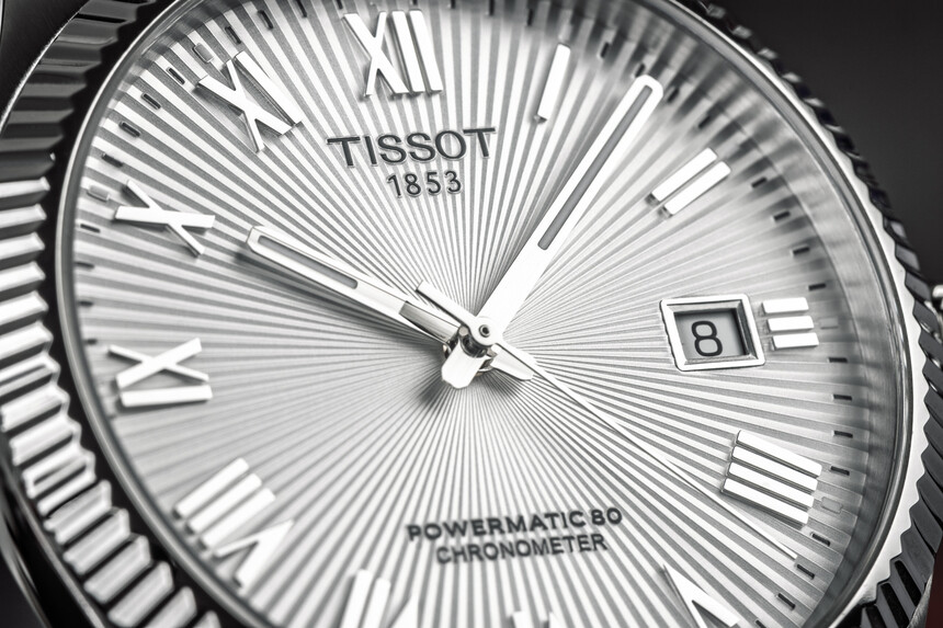 Mnie osobiście bardzo ucieszyły rzymskie indeksy godzinowe, do tego aplikowane. Do zegarka tego typu pasują znakomicie, a Tissot dodatkowo odróżnia tym model od tańszej wersji kwarcowej, która miała jedynie indeksy pałeczkowe. Poza indeksami na tarczy znajdziemy jeszcze okienko datownika na godz. 3 oraz napisy producenta odnoszące się do parametrów mechanizmu.
