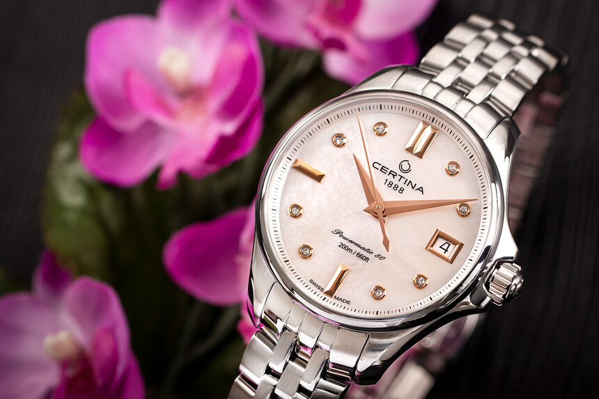 Drugą rekomendacją jest nasz bestseller w średniej klasie – marka Certina. Model z kolekcji Aqua jest nie tylko piękny, kobiecy i elegancki, ale też praktyczny. Ma wysoką wodoszczelność, w pełni stalowe wykonanie, szkło szafirowe – dzięki czemu to idealny zegarek dla kobiety, która nie chce się zastanawiać, kiedy trzeba go zdjąć.