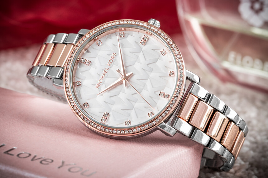 Drugim jest delikatniejszy Pyper, łączący dwa kolory metalu, cyrkonie i ikoniczne logo MK na tarczy.