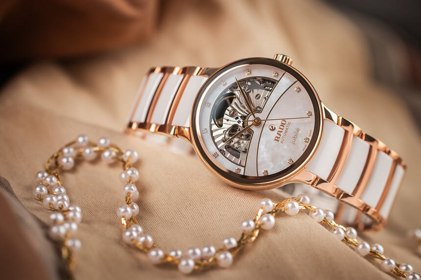 Zaczniemy od modelu Rado z diamentami, masą perłową, ale przede wszystkim z otwartym widokiem na mechanizm i ceramiczną bransoletą. Elegancja, pokaz rzemiosła zegarmistrzowskiego i wspaniały dodatek choćby do perłowych kolczyków.