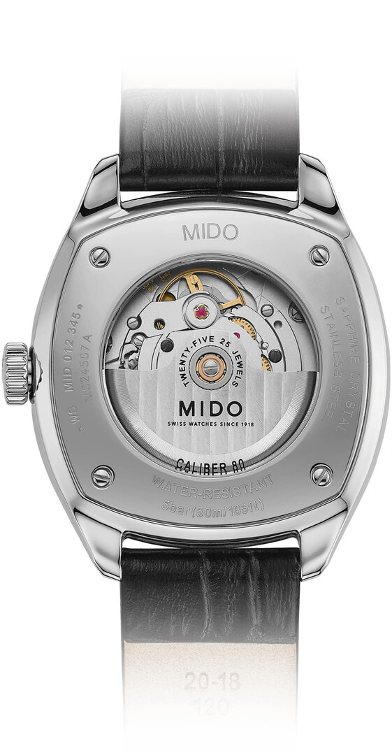 Mechaniczny z automatycznym naciągiem. Mido Caliber 80 zbudowany na ETA C07.621 zbudowany na ETA 2836-2 zbudowany na ETA 2824-2, Rezerwa chodu 80h, 21.600 BPH (3Hz), 25 kamieni