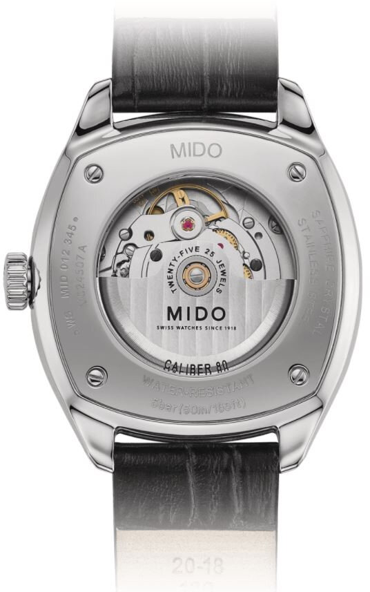 Mechaniczny z automatycznym naciągiem. Mido Caliber 80 zbudowany na ETA C07.621 zbudowany na ETA 2836-2 zbudowany na ETA 2824-2, Rezerwa chodu 80h, 21.600 BPH (3Hz), 25 kamieni