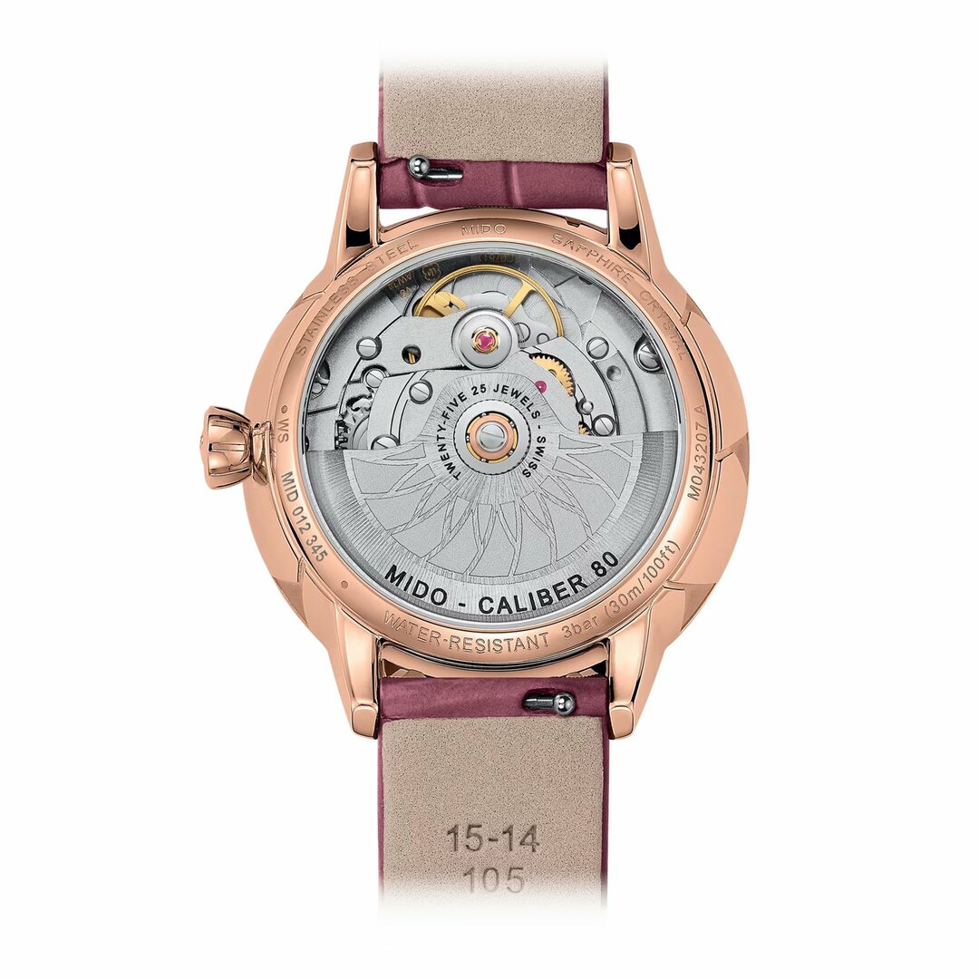 Mechaniczny z automatycznym naciągiem. Mido Caliber 80.611 zbudowany na ETA C07.611 zbudowany na ETA 2824-2, Rezerwa chodu 80h, 21.600 BPH (3Hz), 25 kamieni