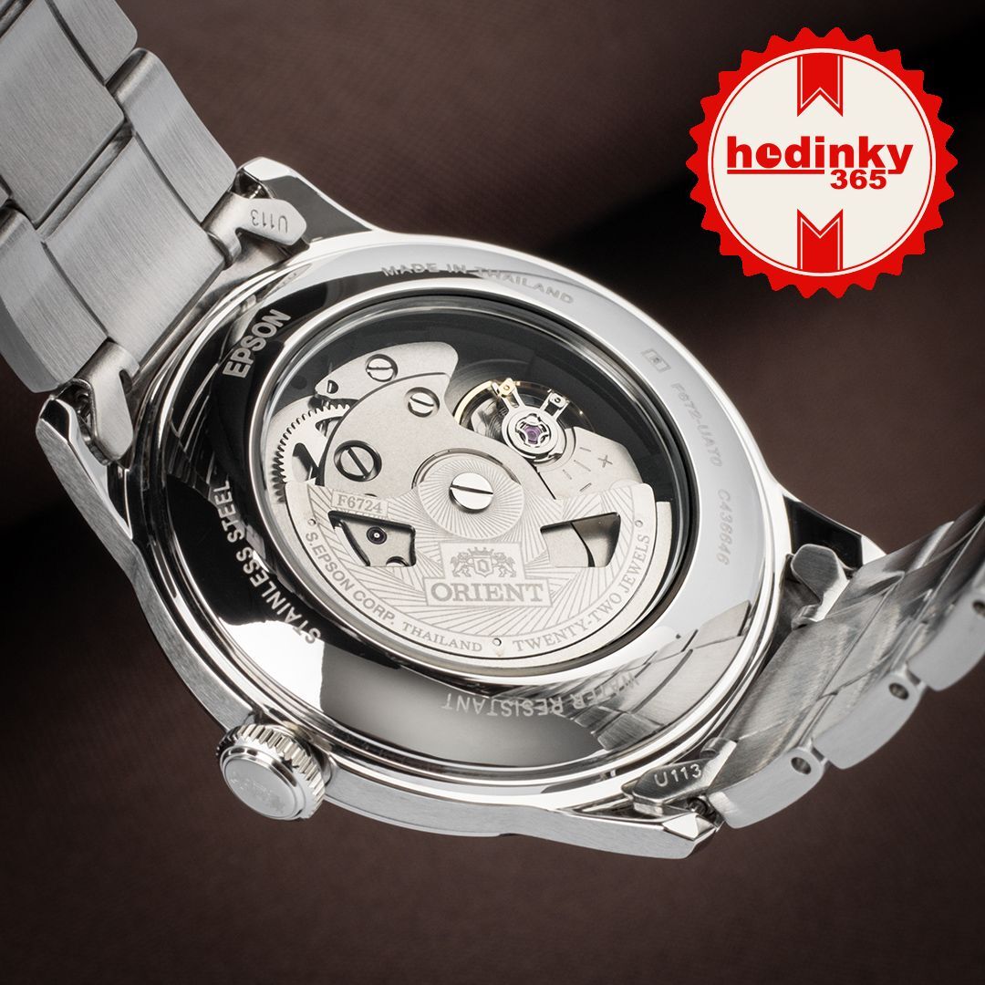 Mechaniczny z automatycznym naciągiem. Orient F6724, Rezerwa chodu 40h, 21.600 BPH (3Hz), 22 kamieni, Hacking, Możliwość naciągu ręcznego