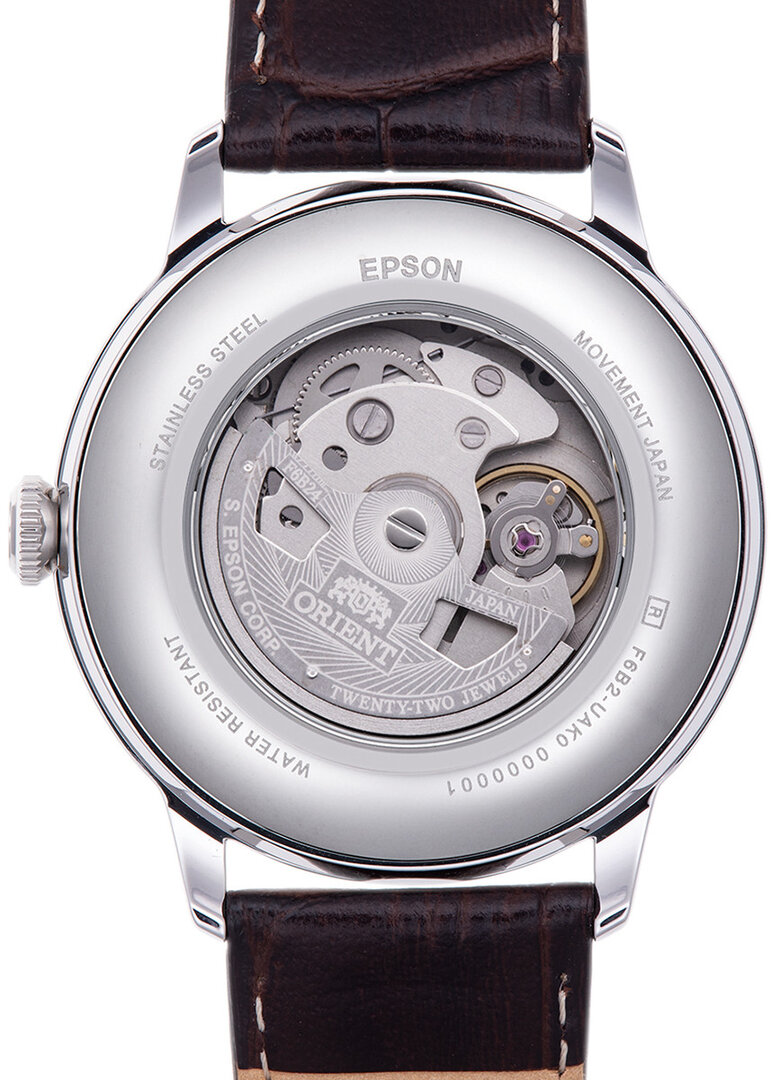 Mechaniczny z automatycznym naciągiem. Orient F6B24, Rezerwa chodu 40h, 21.600 BPH (3Hz), 22 kamieni, Hacking, Możliwość naciągu ręcznego, Obustronny naciąg