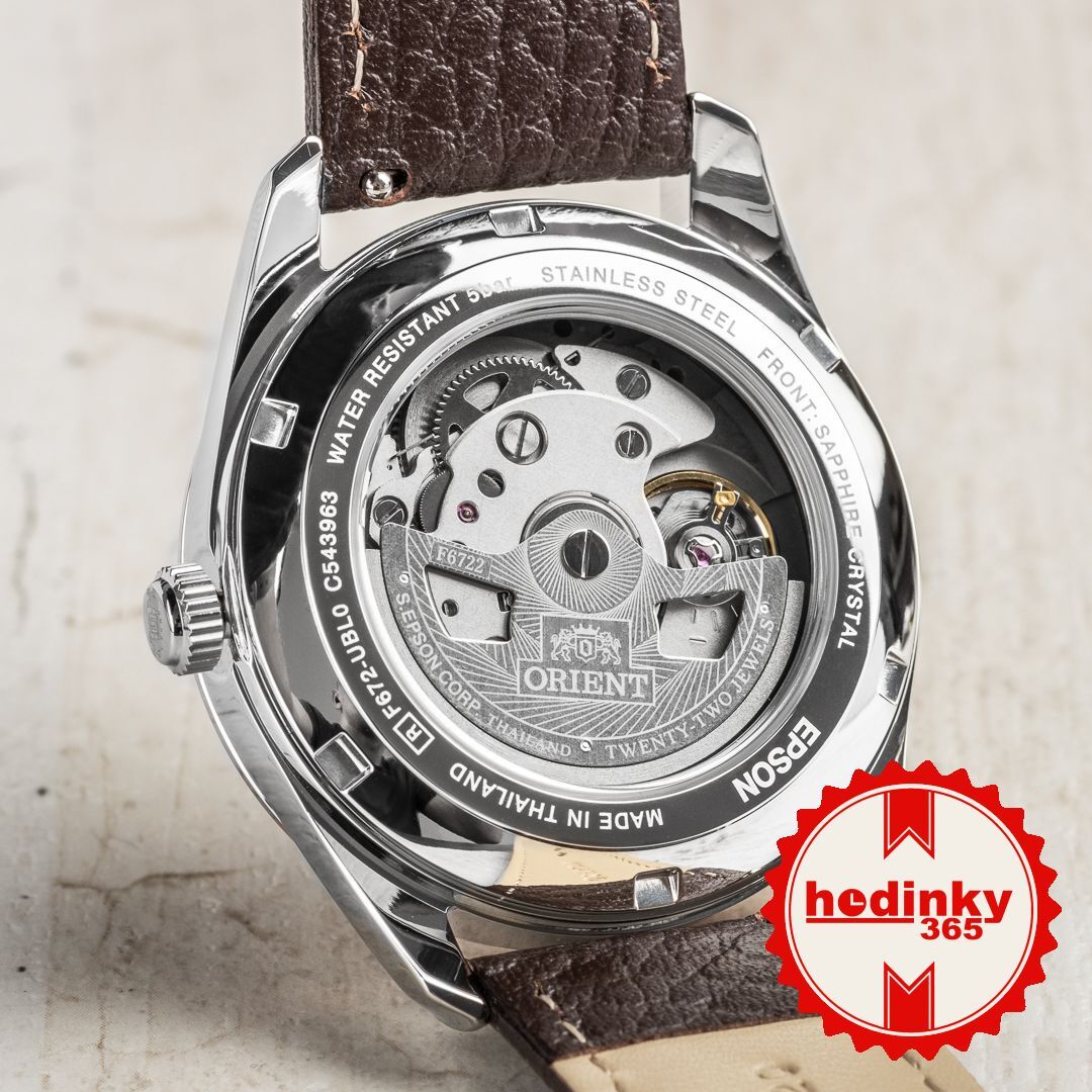 Mechaniczny z automatycznym naciągiem. Orient F6722, Rezerwa chodu 40h, 21.600 BPH (3Hz), 22 kamieni, Hacking, Możliwość naciągu ręcznego