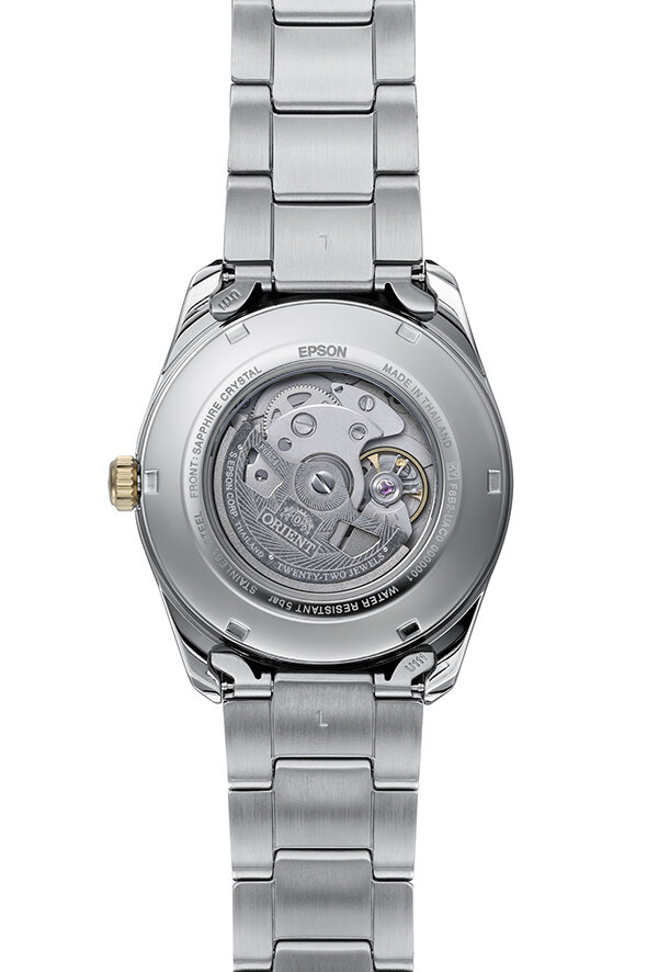 Mechaniczny z automatycznym naciągiem. Orient F6B24, Rezerwa chodu 40h, 21.600 BPH (3Hz), 22 kamieni, Hacking, Możliwość naciągu ręcznego, Obustronny naciąg