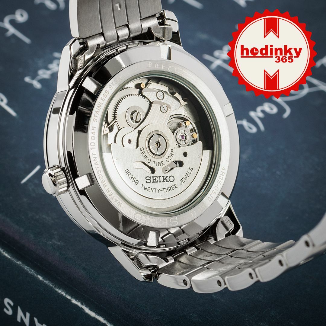 Mechaniczny z automatycznym naciągiem. Seiko 4R35, Rezerwa chodu 41h, 21.600 BPH (3Hz), 23 kamieni, Hacking, Możliwość naciągu ręcznego, Obustronny naciąg