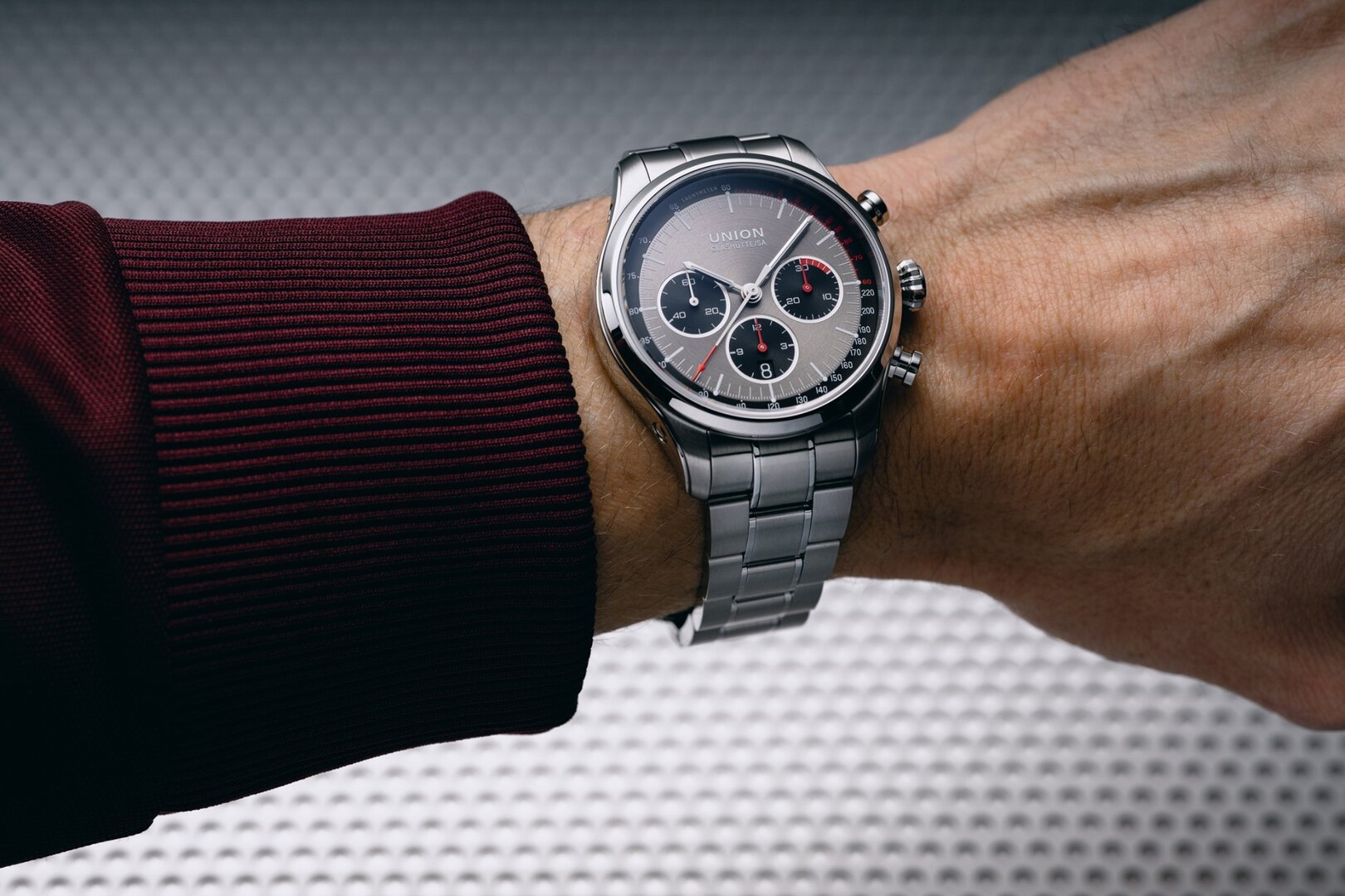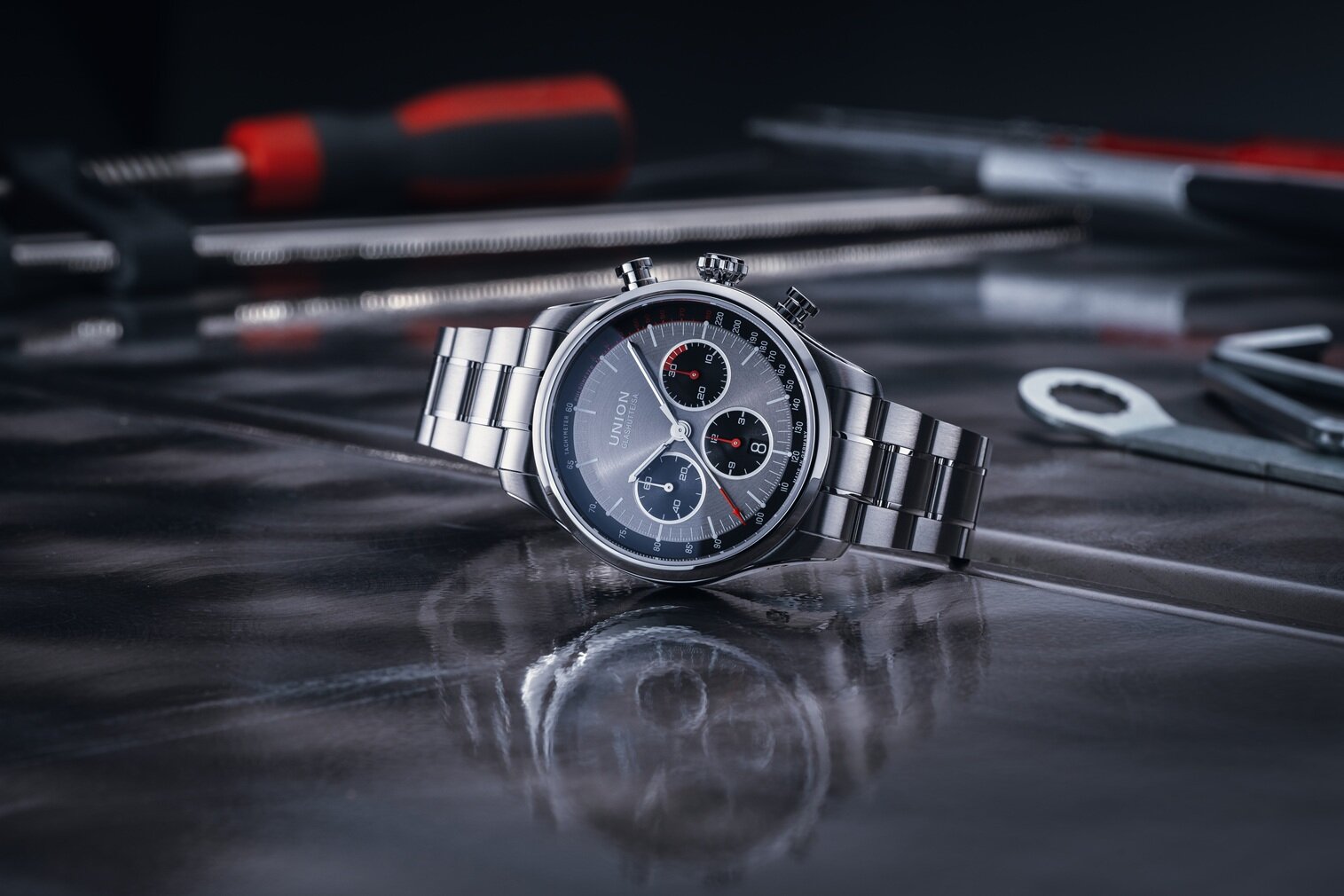 Mechaniczny z automatycznym naciągiem. Union Glashütte UNG-27.S1 zbudowany na ETA/Valjoux 7753 zbudowany na ETA/Valjoux 7750, Rezerwa chodu 65h, 28.800 BPH (4Hz), 29 kamieni, Hacking, Możliwość naciągu ręcznego